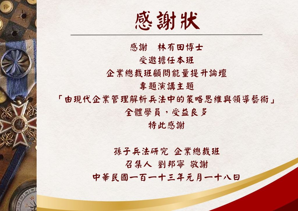 20240118孫子兵法總裁班林有田博士感謝狀 1 2024-01-182024-01-19 Written by eragon11355 分享此文: 分享到 X(在新視窗中開啟) X 分享到 Facebook(在新視窗中開啟) Facebook 喜歡 正在載入...