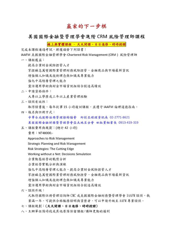CRM美國國際風險管理師認證 0 2025-06-11 Written by eragon11355 分享此文: 分享到 X(在新視窗中開啟) X 分享到 Facebook(在新視窗中開啟) Facebook 喜歡 正在載入...